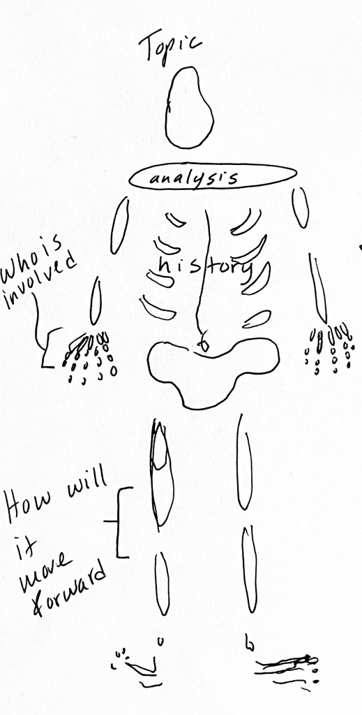 I explain that outlines are like bones: the simplest version of our thoughts made into artifacts and assembled to create a being that will have to move. What I mean by ‘move’ is that each part is connected to the rest of the piece, echoing, expanding, or clarifying each portion. You can’t bring a piece to life without an idea of how it’s working as a whole.